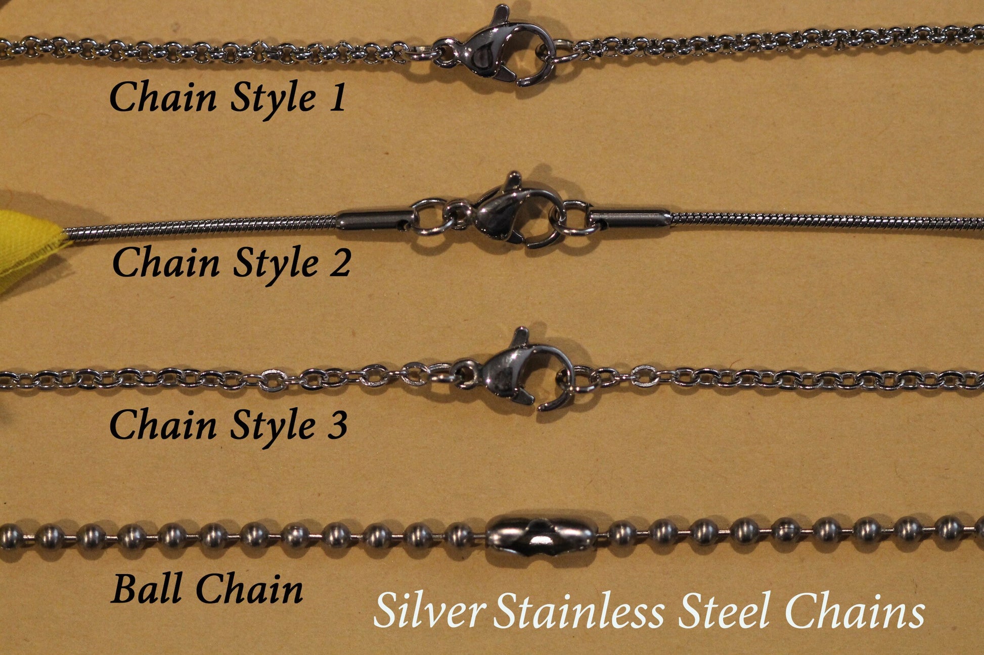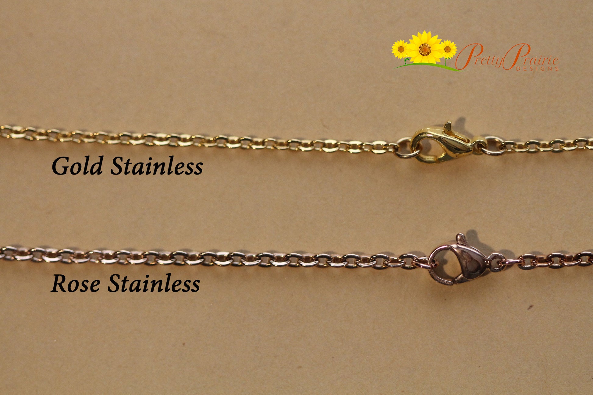 CHAINS: I offer 7 chains to choose from including: four stainless, a gold stainless, a rose gold stainless, and a leather, in various lengths.