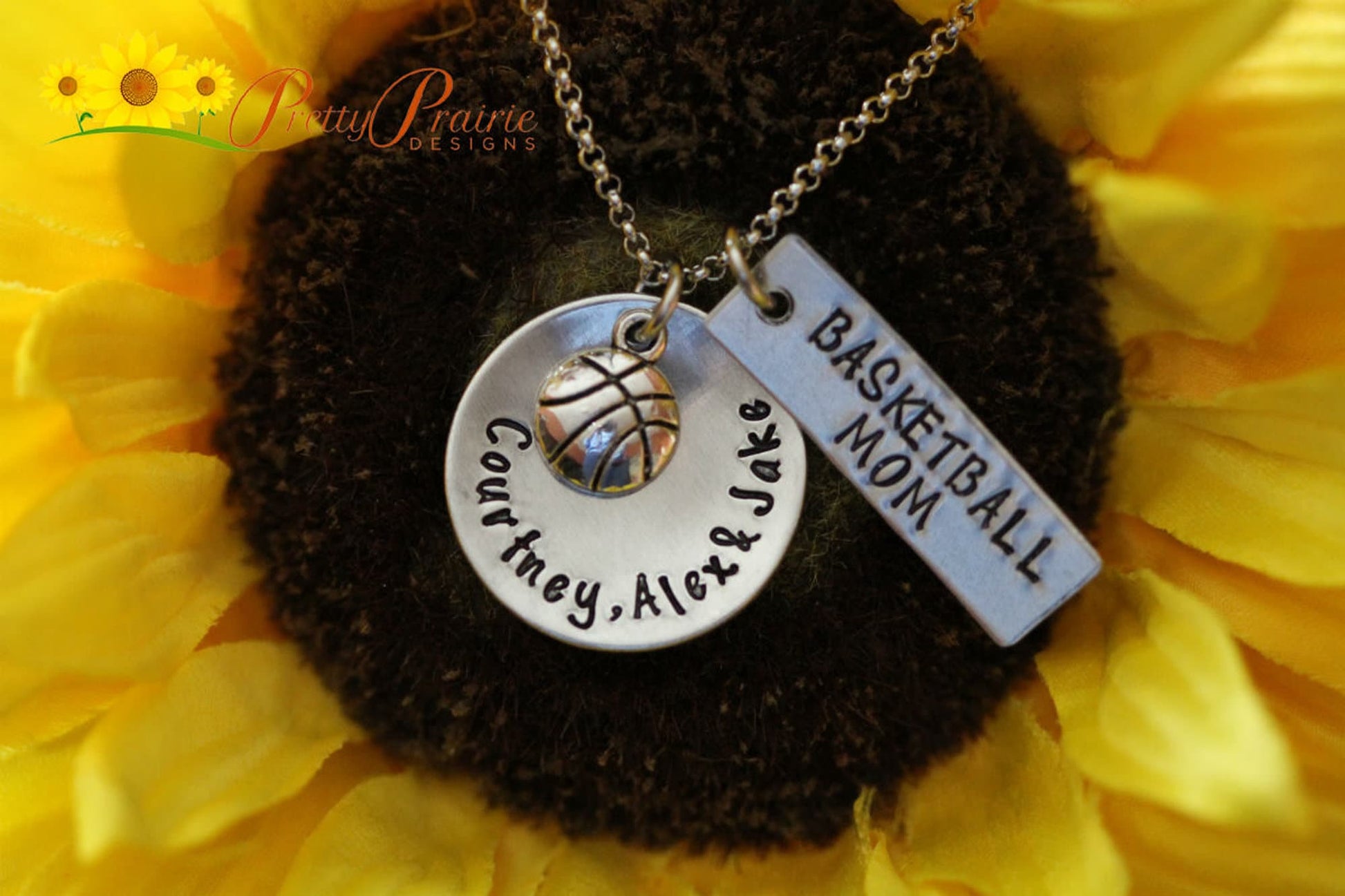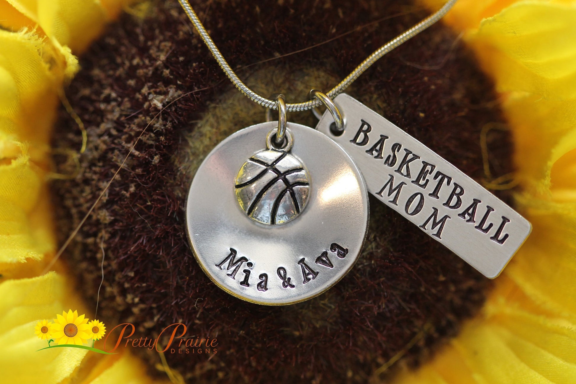 Basketball Mom Name Necklace: This aluminum, copper, or brass disc necklace or keychain will be hand stamped with your players' names (up to 3 names) and a matching tag with "BASKETBALL MOM or BASKETBALL DAD" that hangs from the side and includes a silver basketball charm. Available in 3 metals. Great gift for a Team Mom. (Not all fonts are available on this necklace.)