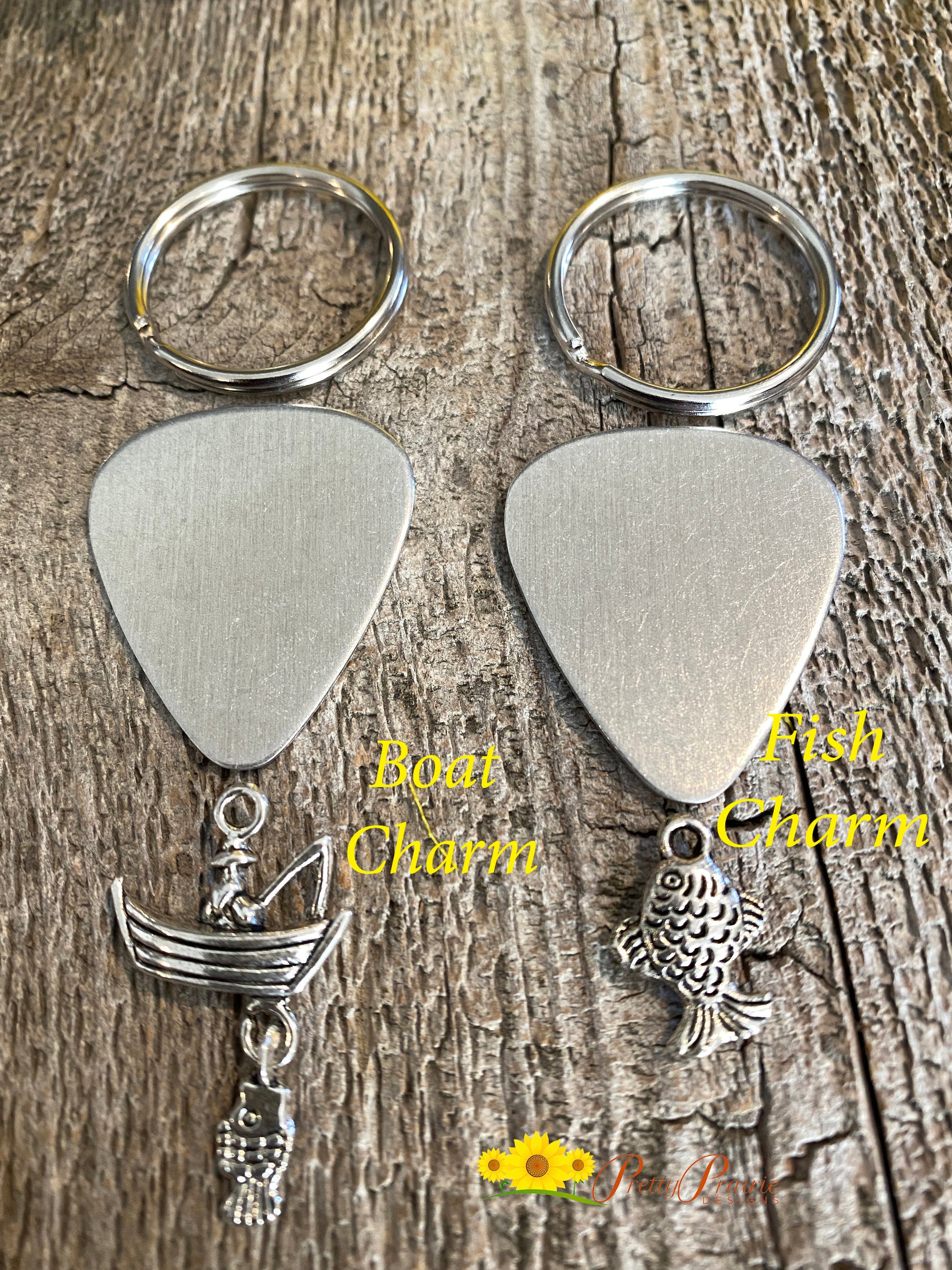 CHARM/KEYRING: If purchasing as a keychain, the keyring is stainless steel and includes a lobster clasp. The boat and fish charms are silver tone. Hook and heart charms are silver, copper, or gold tone and will match the lure metal you choose. All charms are made from a zinc alloy metal, which is lead and nickel free.