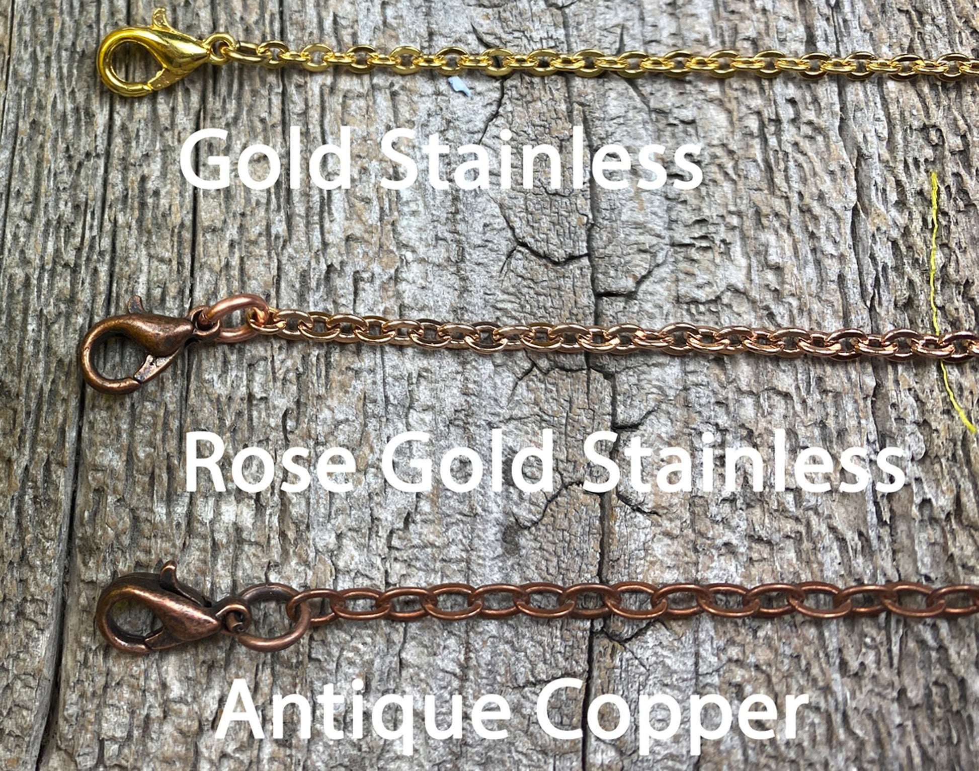 CHAINS: I offer 8 chains to choose from including: four stainless, a gold stainless, a rose gold stainless, an antique copper, and a leather, in various lengths.