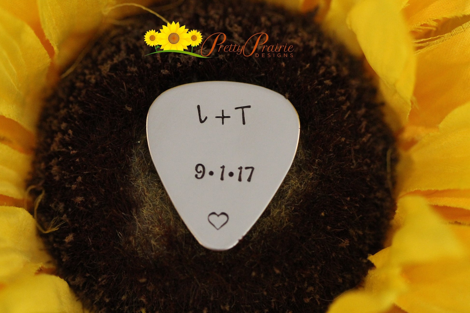 Initial and Date Guitar Pick, Anniversary Gift, Hand Stamped Pick, Engraved Guitar Pick, Retirement Gift, Personalized Pick, Metal Pick